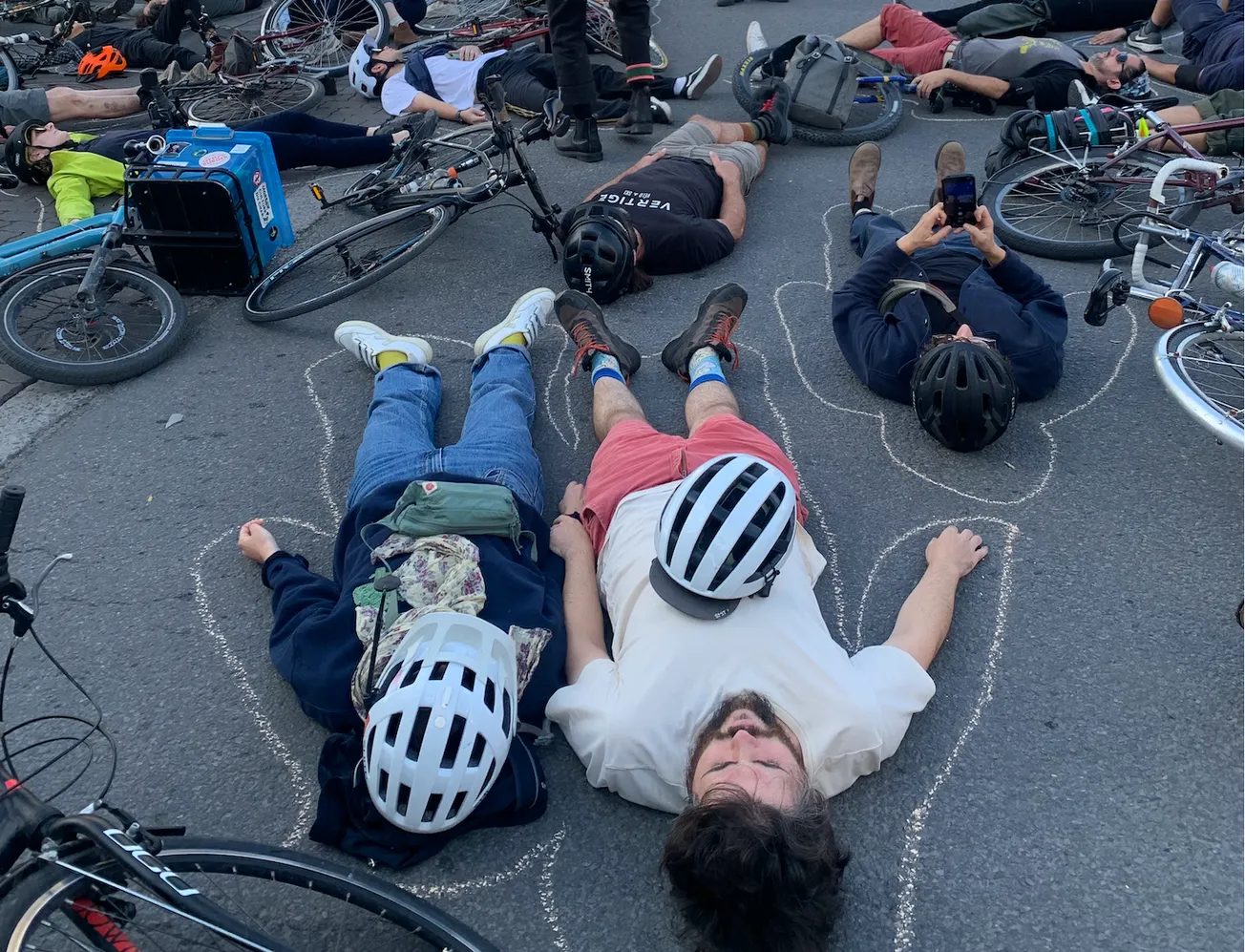 Update: Since writing this post, a 31-year-old woman on a bicycle was killed by the driver of a truck a block away from our apartment, at the busy intersection of Ave. du Parc and Bernard. The following day, on Sep. 8, a "die-in" demonstration was held there at around 5 pm: at the height of rush hour. (I happened to be riding my bicycle by the intersection that day; see photo above.) A hundred or more people lay down next to their bikes, blocking motor vehicles, while the police held back traffic. Late last year, a boy was killed by a truck at the same intersection (there was a memorial to him in place for months, with people leaving flowers and other tributes on the corner). As I explain in the post, the municipal opposition party, Ensemble Montréal, is trying to provoke a "bikelash," stirring up the resentment of people who drive against the construction of protected bike lanes—its leader, Soraya Martinez Ferrada, is threatening to hold an audit of all existing lanes, and rip out those she deems unnecessary or unsafe. (For context, there's a municipal election scheduled for Nov. 2, and since mairesse Valérie Plante, of Projet Montréal, has bowed out of the race, they're counting on the public's unfamiliarity with her successor, Luc Rabouin, to help them build momentum.)