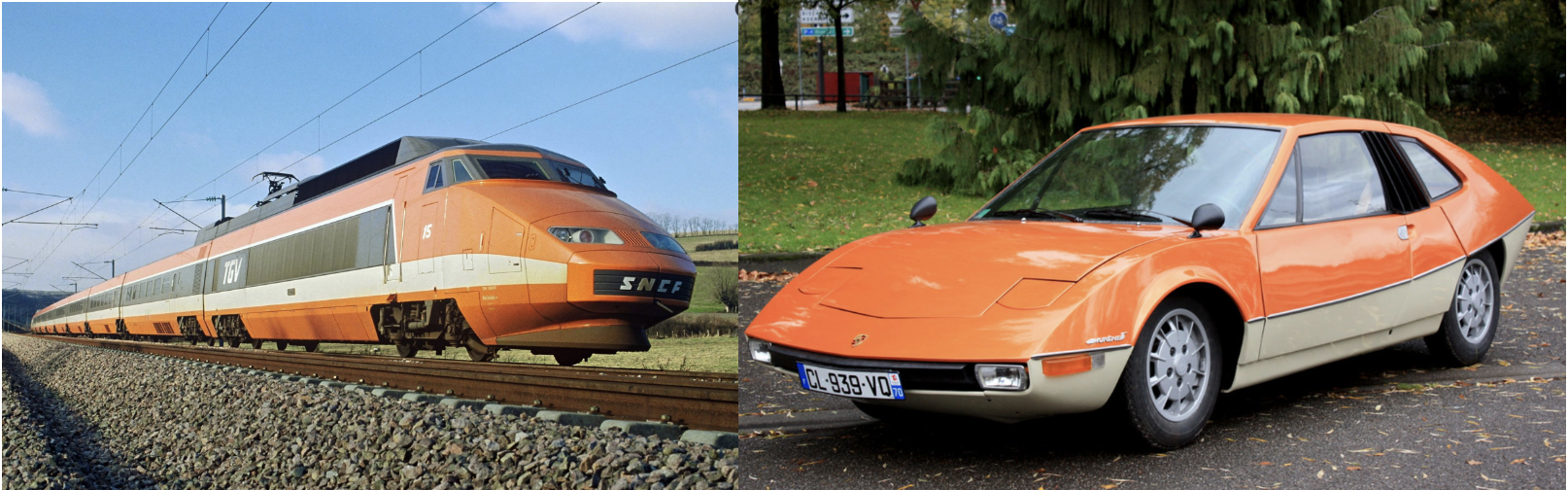 Take the TGV M, which Alstom unveiled to the public last week in Paris's Gare de Lyon. The train à grande vitesse (TGV) is now a mature technology in France, the second country, after Japan, to really throw itself into the development of bullet trains. (I'm aware some Italians might object to that statement.) The first TGV, code-named C01, was something to see. Its designer, Jacques Cooper, whose specialty was sports cars, modeled its aerodynamic nose on the front of a Porsche Murène (see above), instructing his clients to envision the train as “metal flowing through space.” It was bright orange on the outside, with clementine-hued leatherette seats inside, and—this being the eighties—phone booths in each car, and ashtrays in every armrest. Most of all, it was fast, faster even than the Shinkansen: in its first year of operation, 1981, the orange streak set a world record of 380 kilometers (236 miles) per hour.