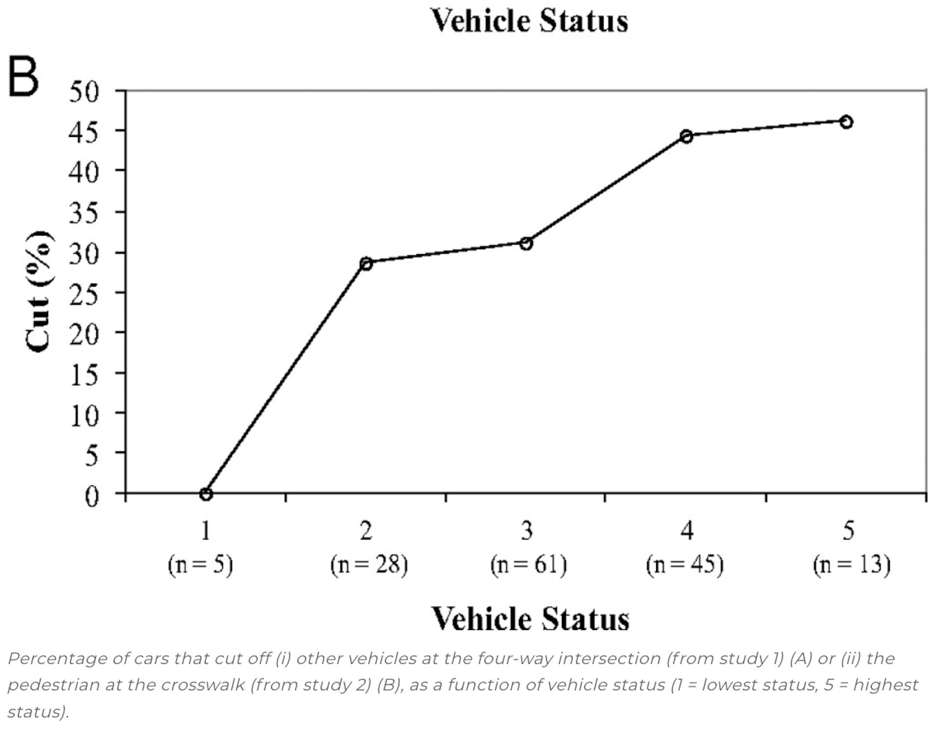 Digging deeper, I’ve found that my observations are confirmed by a University of Michigan study published in the Proceedings of the National Academy of Sciences1 entitled “Higher social class predicts increased unethical behavior.” In addition to a whole bunch of other nastiness, owners of soi-disant luxury cars were found to be three times less likely than drivers of “lower status” cars to give pedestrians the right of way, and four times more likely to cut off other drivers.