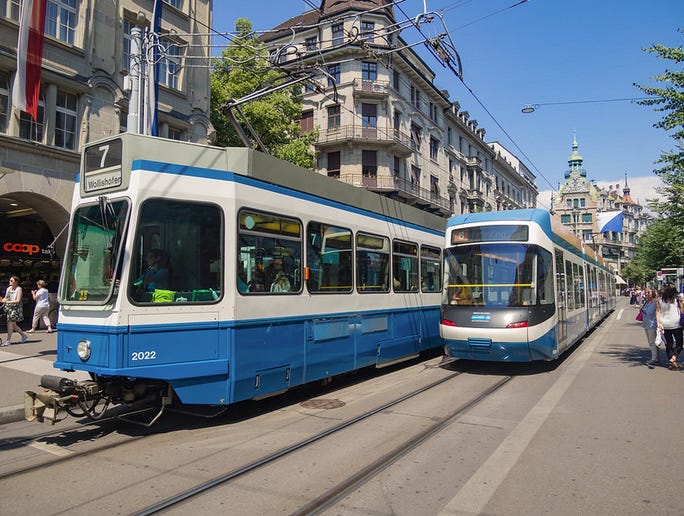…as well as the options in its larger cities, such as Zürich, with its trams, of which philosopher Alain de Botton wrote: "There's little reason to travel in an automotive cocoon when, for a fare of only a few francs, an efficient, stately tramway will provide transportation from point A to B at a level of comfort an emperor might have envied."